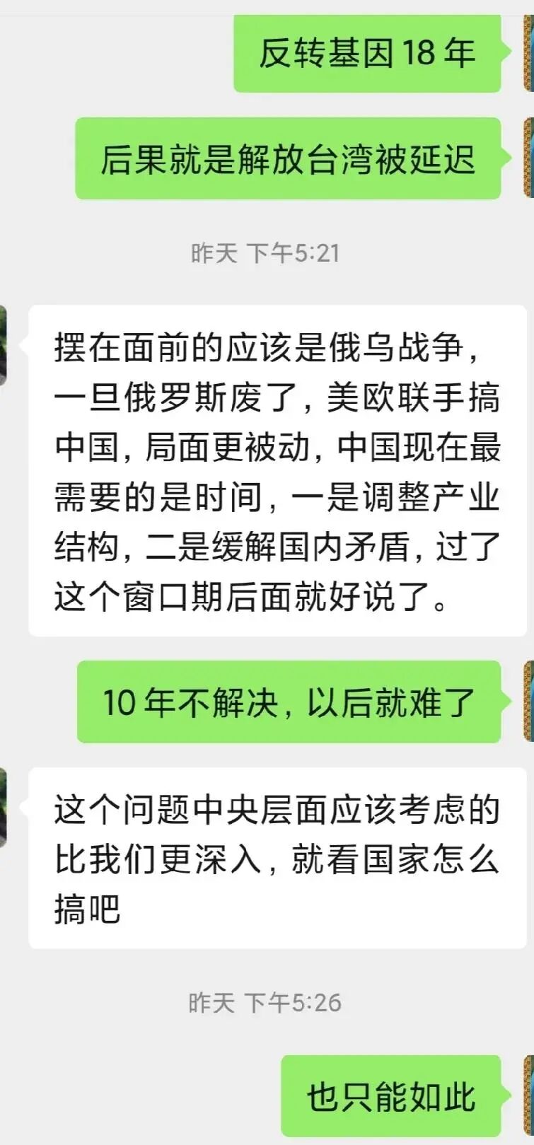 他指出,正是自2004年开始的反转基因运动,极大干扰了国家统一两岸的战略部署。反转基因十几年,代价不可谓不惨重!