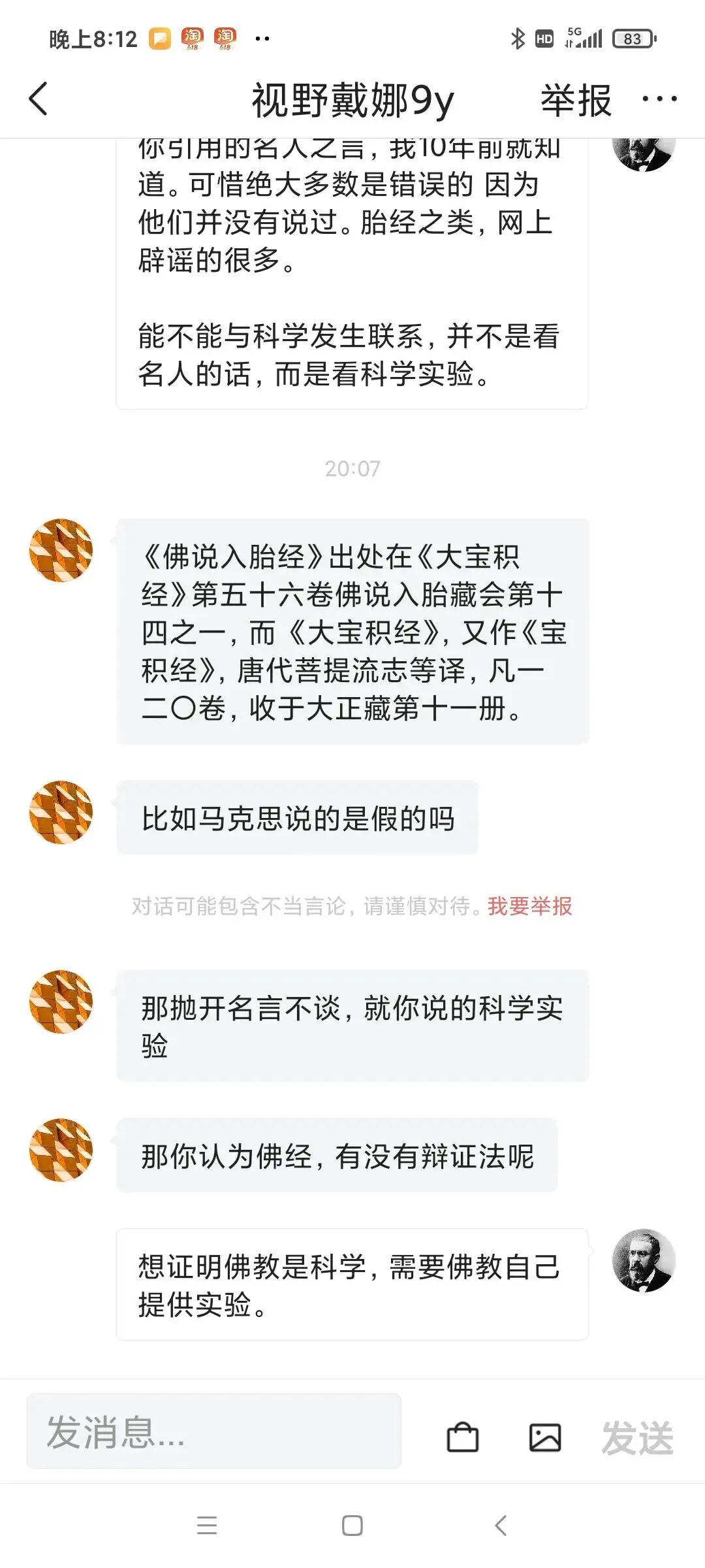 今天有个自称“大学生”的人私信我,向我提出问题,问我关于佛学的问题。