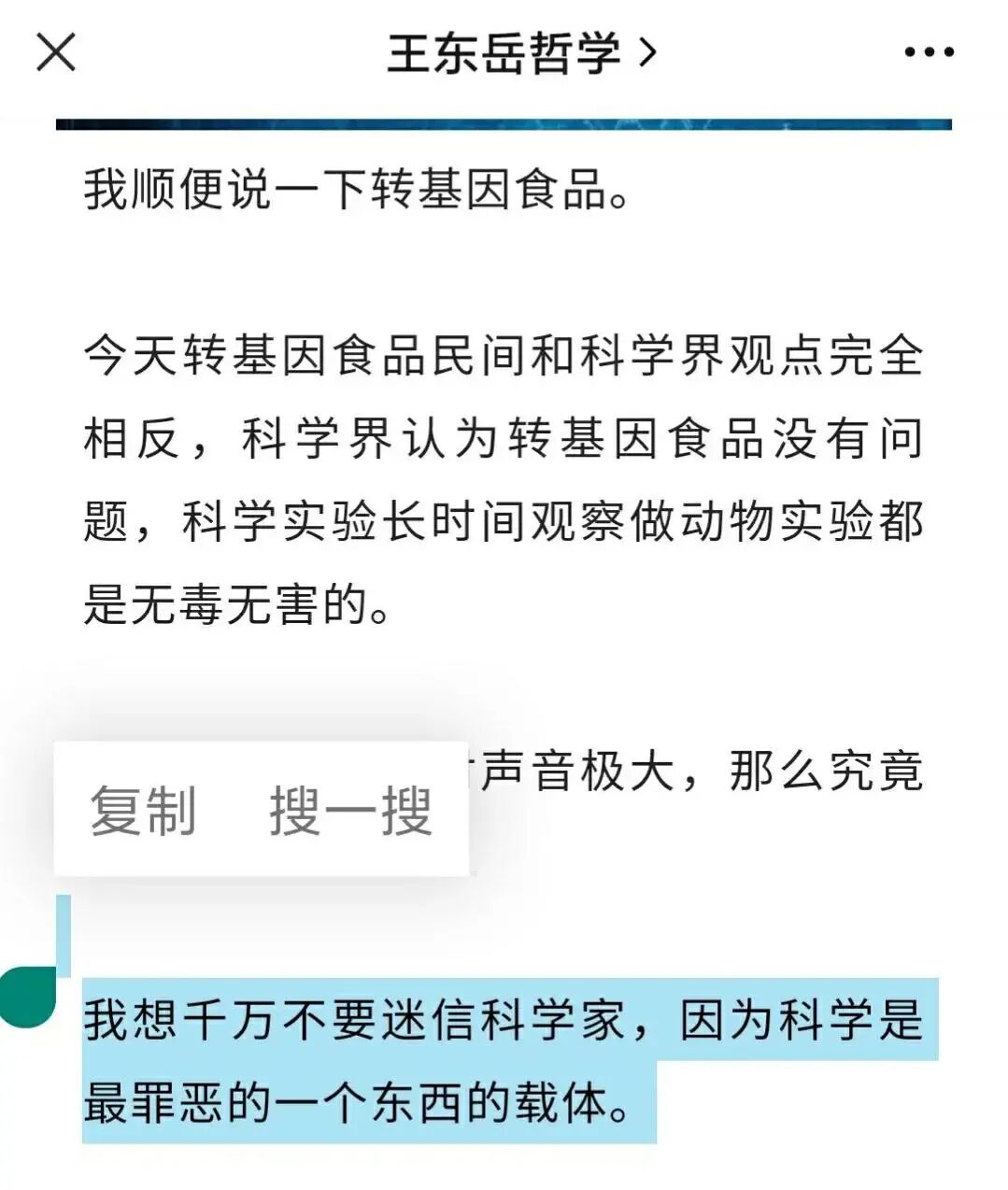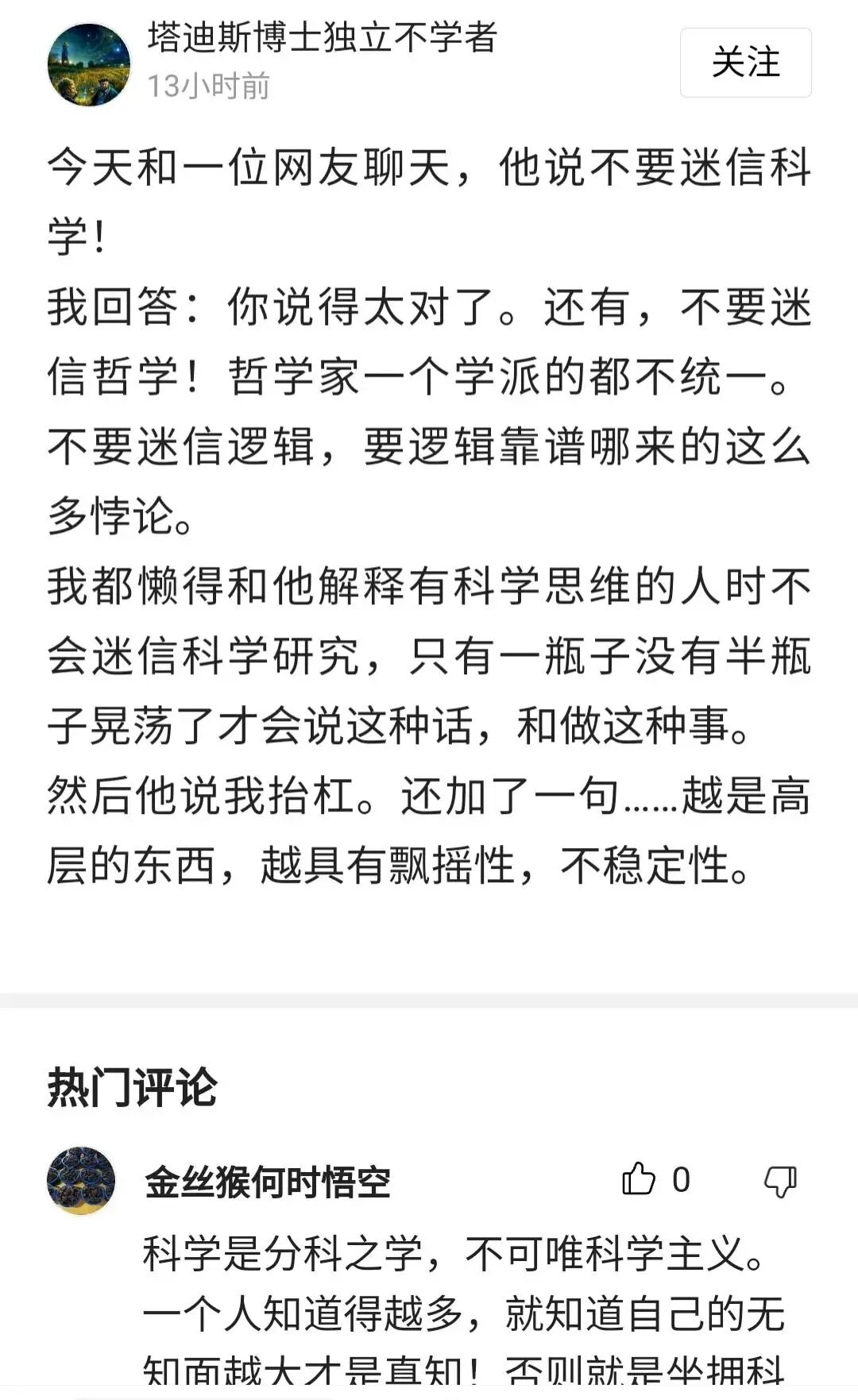 @塔迪斯博士独立不学者说过,他经常与迷信王东岳的人交流,发现这些人都有一个共同点,也是把“不要迷信科学”这类鬼话当成口头禅。