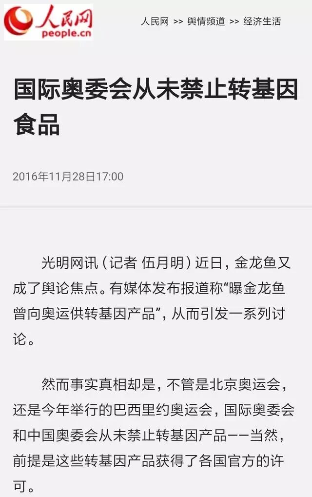 人民网、光明网辟谣:事实真相是,不管是北京奥运会,还是巴西里约奥运会,国际奥委会和中国奥委会从未禁止转基因产品——前提是这些转基因产品获得了各国官方的许可。