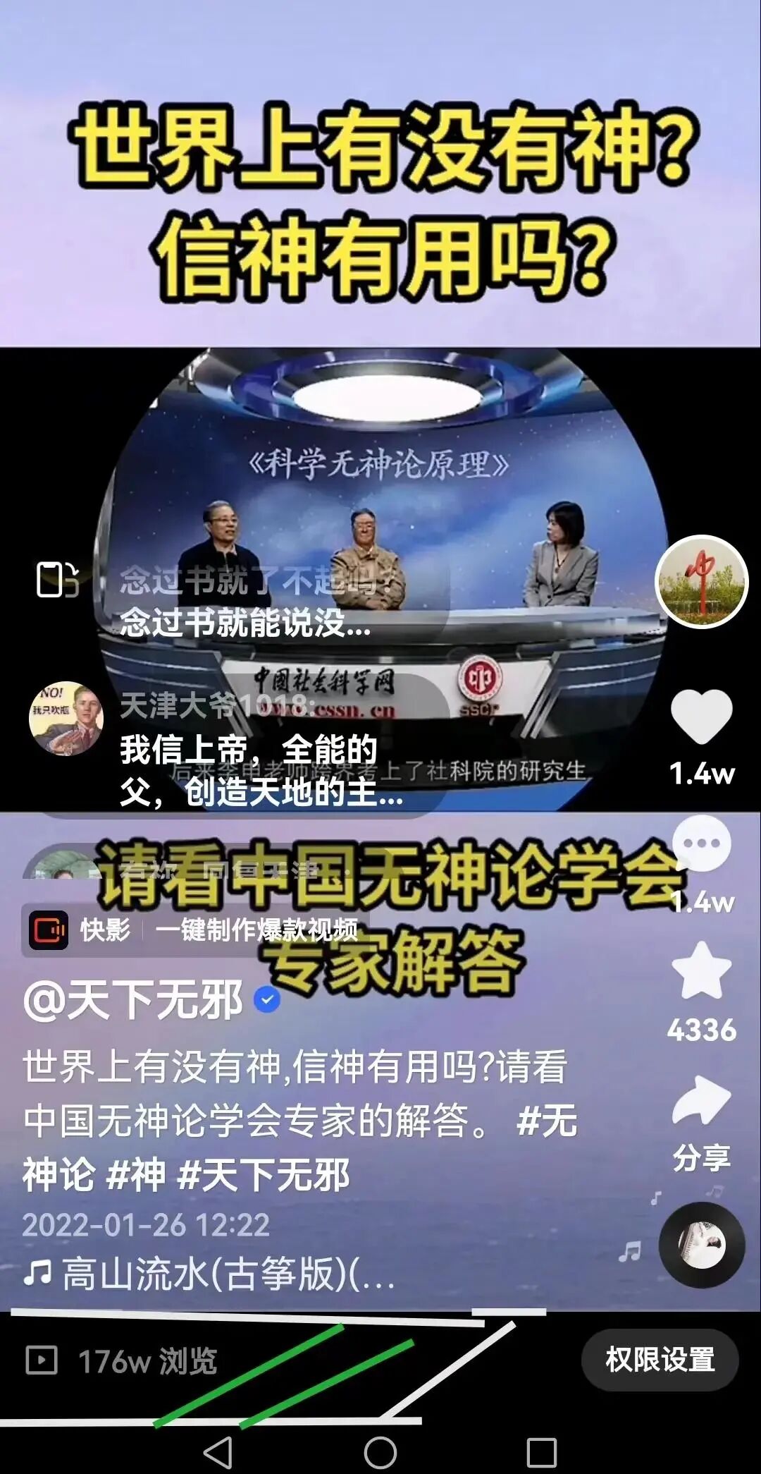 我身边有一个朋友,叫做秦耀东,他刚刚注册了快手,自费推广马克思主义和无神论,虽然一个月用掉1000元——已经是他的一个月生活费——但他一直在坚持做。他是毛主席的忠诚粉丝,经常发正面题材,阅读量就很高。他也积极宣传了无神论。我们官方的中国无神论研究机构,比如中国无神论学会也可以注册账号啊。