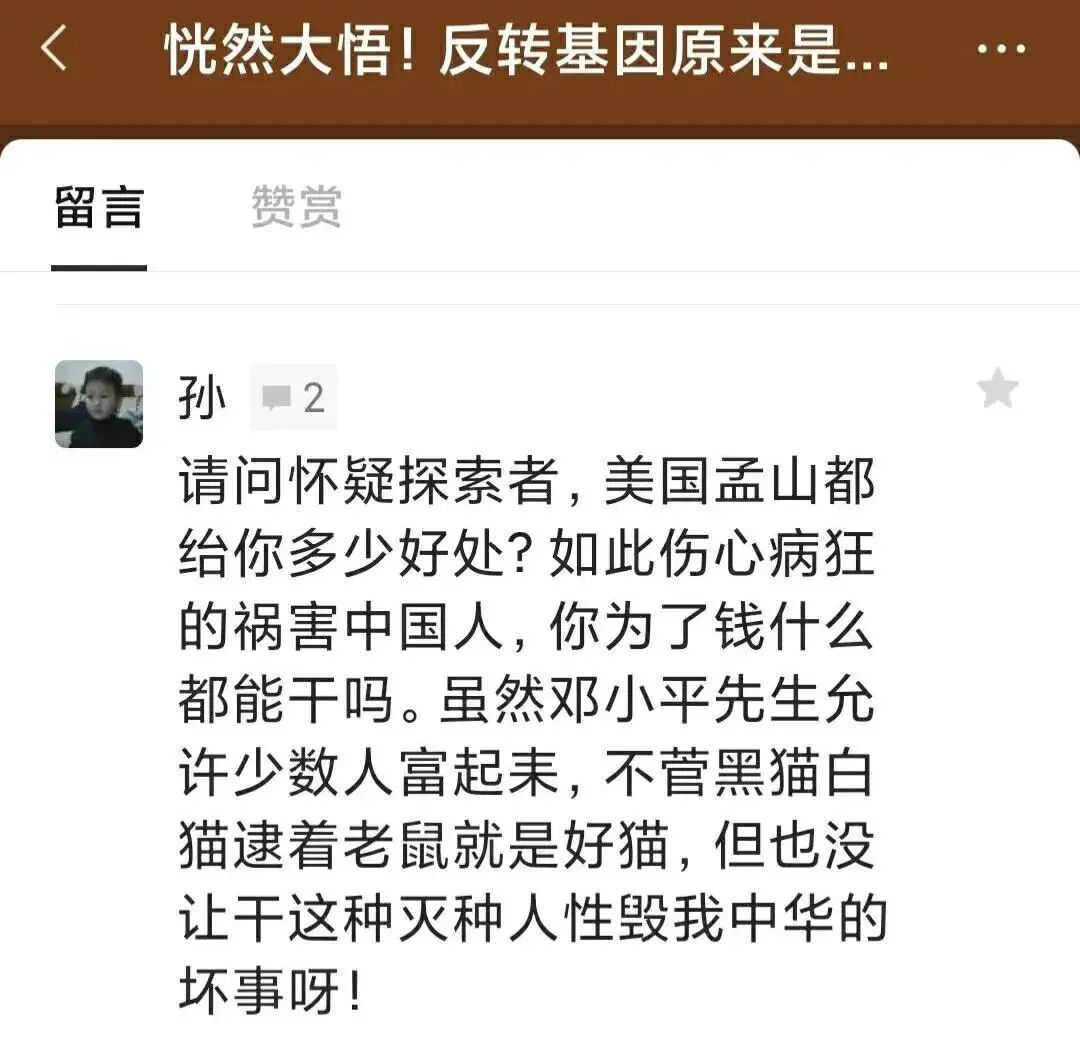 这里,仅仅贴出一个看起来似乎稍微还能拿出来的截图,依然是反转人士的老一套缺陷——自己没有搞清楚,就喜欢一上来就骂。开口就下三滥的诋毁作者的人格。你可以不懂,也可以不喜欢,但你无权诋毁别人的人格。就像这个ID叫“孙”的网络痞子,劈口第一句话就是诋毁我“拿了孟山都的好处”。