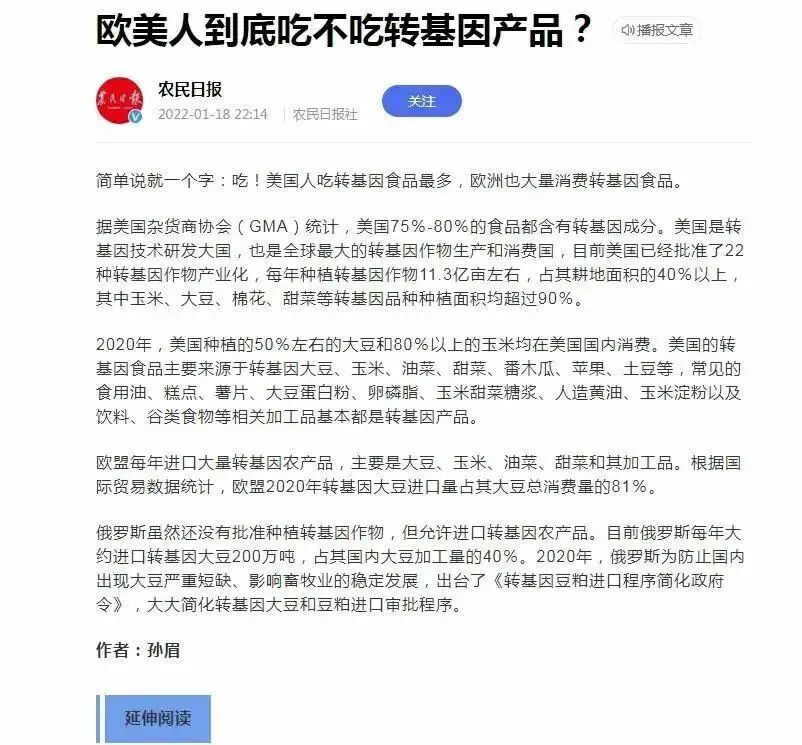 我要说明一下,我支持给转基因食品标注,几乎所有的挺转者都是支持转基因标注的。其实,早在2002年中国政府已经立法,明文规定必须标注,早就给了消费者知情权和选择权。我也希望这样的政策可以继续执行下去。