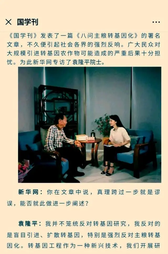 篇幅有限,下面仅列举袁隆平院士对转基因的观点,资料全部来源于人民网这样的中央级官方媒体,没有一个来源于自媒体。