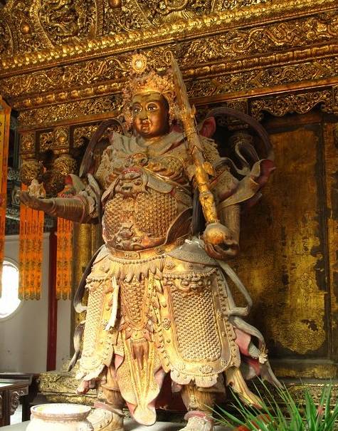 如果韦陀像左手单立掌,以右手托降魔杵立于胸前,或者是左手托降魔杵立于胸前,右手托一个小的物件,则说明这里是半十方丛林,原则上只允许游方僧人挂单三天。像著名的洛阳白马寺,就是半十方丛林。下面是白马寺天王殿的韦陀像。