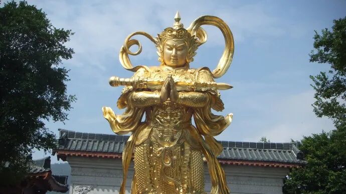 如果韦陀像双手合掌,降魔杵横置于双掌之上,证明这里是十方丛林,游方僧人可以在这里长期的挂单。只要他们不主动选择离开,理论上就可以一直住下去。如下图: