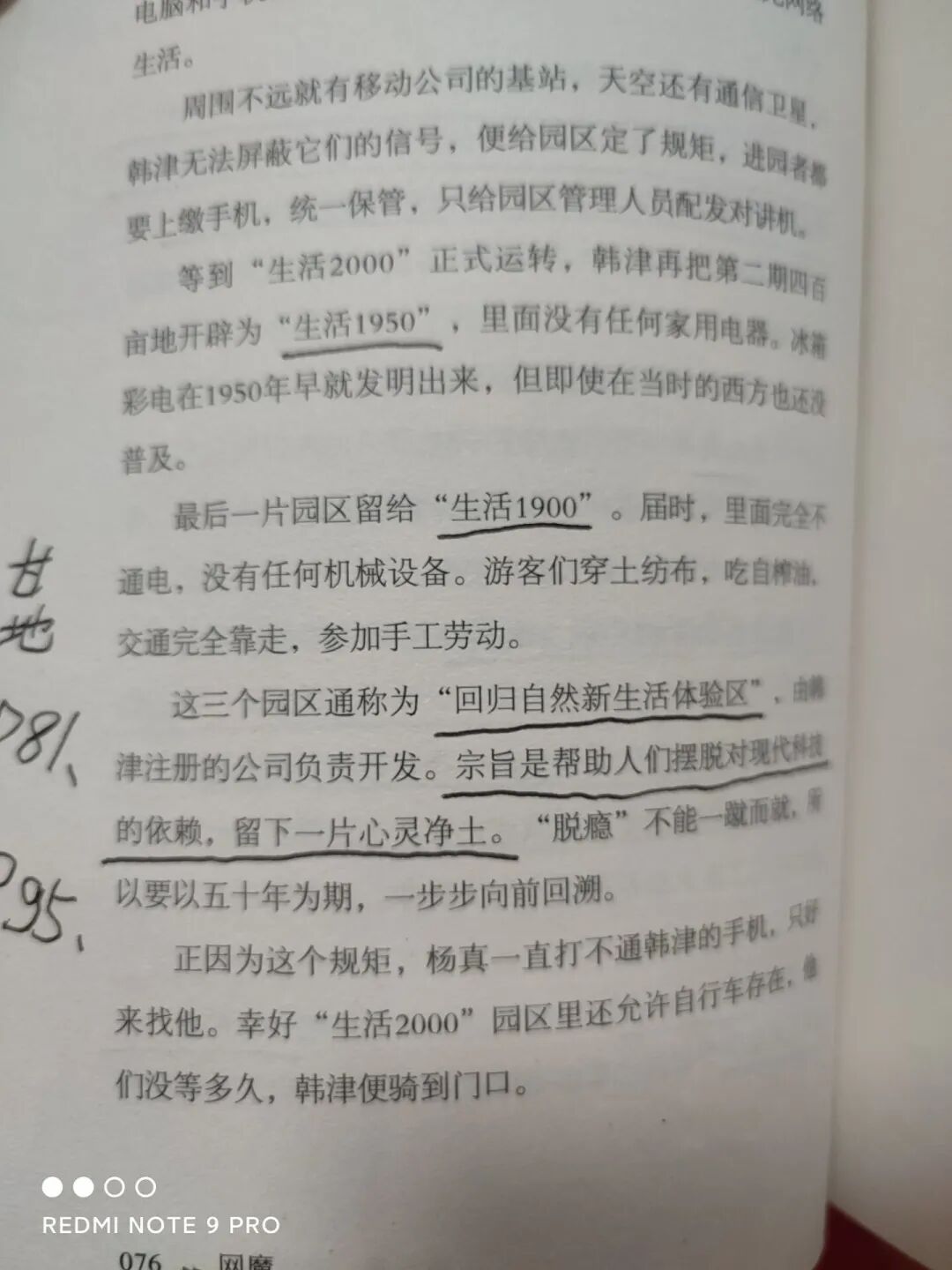 为了实现这样的理想,韩津一方面不断地宣传“警惕科学,警惕科学家”,号召人民摧毁科学实验室,一方面筹建了基金会,目的是搞一个乌托邦式的体验区。小说中这一设定也有现实原型。现实中北京师范大学的田某就做过这样的事情,而且田某更是xxx的理论总军师。在小说中的这个体验园区内,排斥了一切的现代工业农业技术。在由于之前在电视台积攒的“敢说话”的口碑,他获得了社会上不少人的支持,包括大量的资金。得到钱的韩津在太行山的山脚下建立起一千二百亩的园区,建造起一些旧式建筑物,他们在园区内主要依赖种植有机农业生活。有机农业产品的产量很低,仅到原产量的五分之一,而且价格很贵,比如一只鸡的价格是外面的十倍。但是韩津巧妙地打出了“有机”“环保”的噱头,自然有人给他买单。