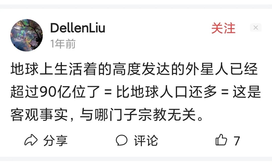 为什么我这样说呢?因为国际上确实有一个邪教组织,说外星人在地球上的数量超过了90亿。所以,很可能是这个网民日常浏览网页,遇见了这些胡说八道,结果就信以为真了。这是我的一个猜测。