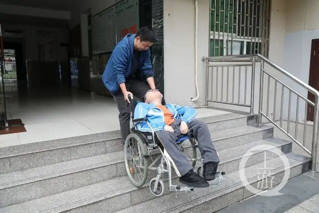 早上7:30到学校,直到下午5点放学,他都只能坐在特制的椅子上。这把椅子已经被磨得变了颜色,扶手是爸爸邓军自己加上去的,还有一个特制的靠垫,让无法直立的邓显松有一个可以倚靠头的地方。”