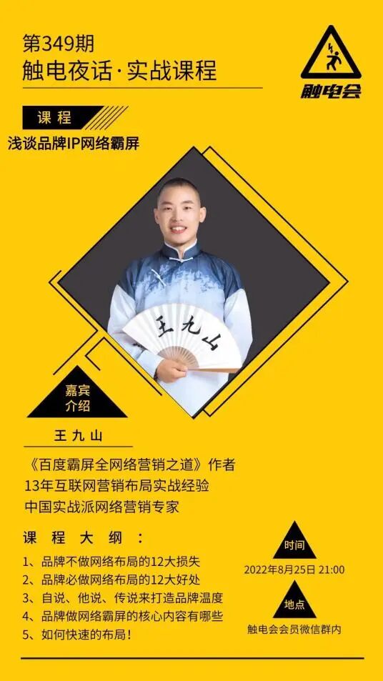 那我们算是正式开始了,问候一下触电会的家人们,大家晚上好,我是今天的分享老师王九山,感谢触电会龚文祥龚老师、陈露露姐的邀请。