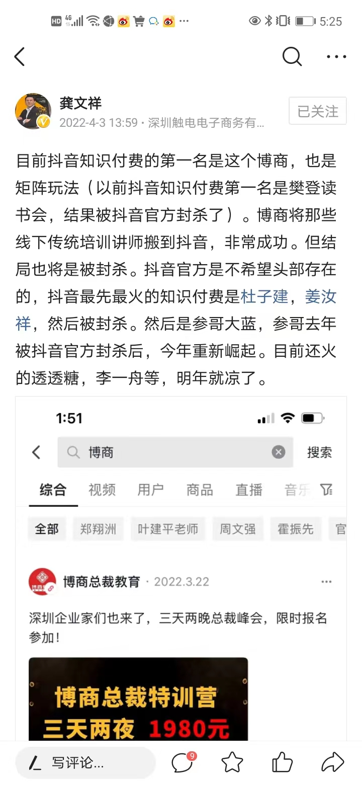 以前,抖音知识付费第一名,是樊登读书会,结果被抖音官方封杀了。博商将那些线下传统培训讲师,搬到抖音,非常成功。但结局也将是被封杀。