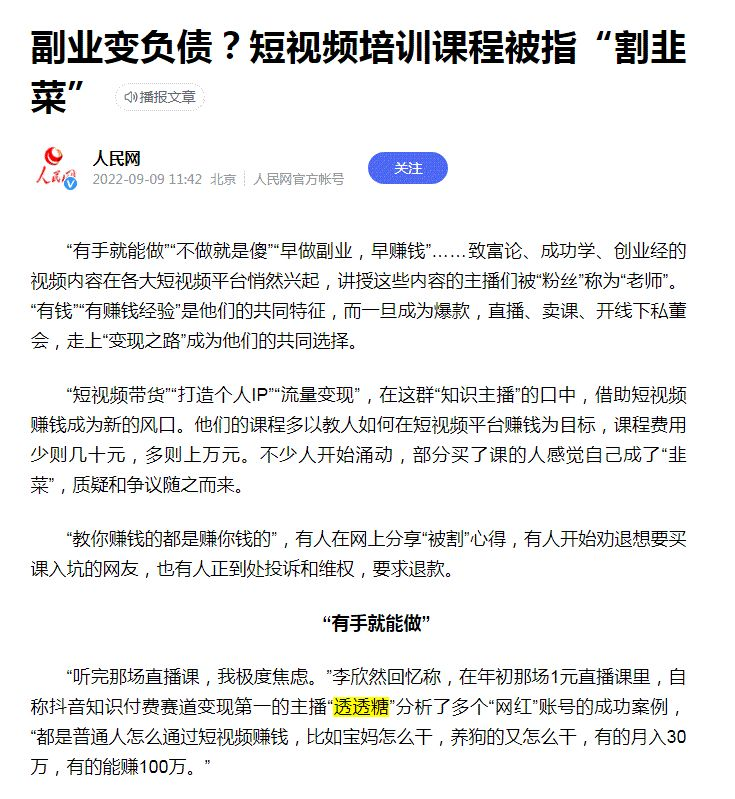 人民网点名抖音的短视频培训课程,知识付费都是割韭菜的,点名了透透糖13次,然后抖音官方赶紧封了她的账号。