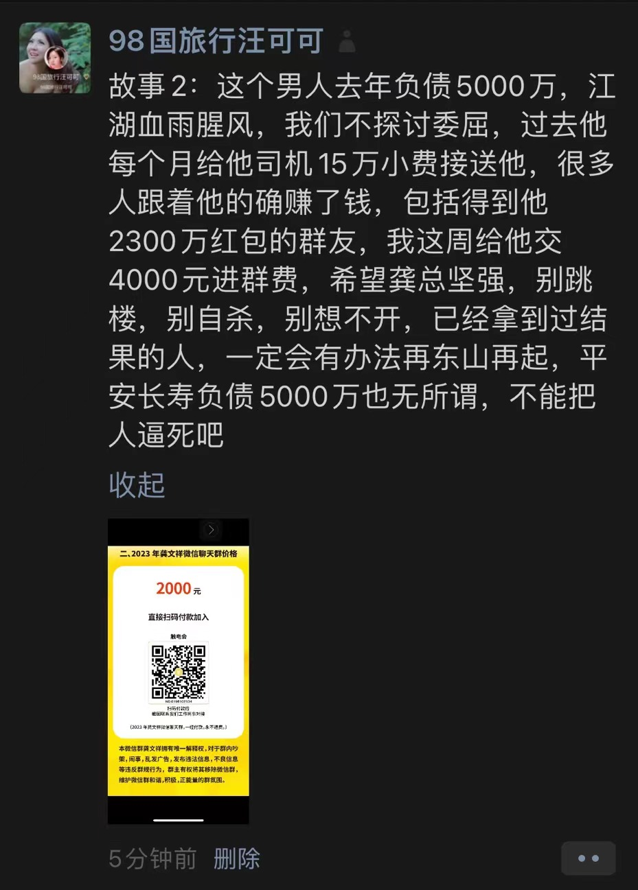 很多人跟着他的确赚了钱,包括得到他2300万红包的群友,我这周给他交4000元进群费,希望龚总坚强,别跳楼,别自杀,别想不开。