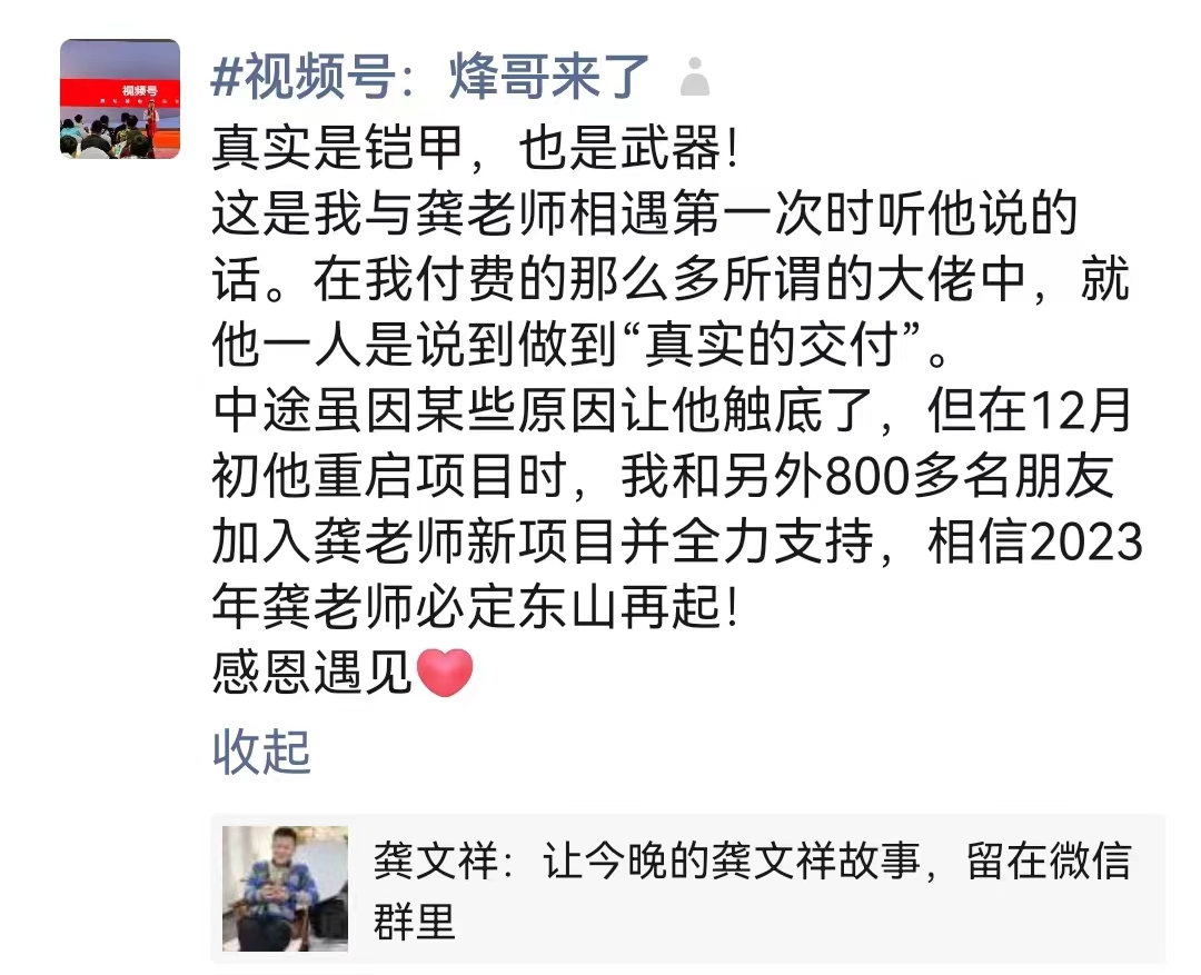 中途虽因某些原因让他触底了,但在12月初他重启项目时,我和另外800多名朋友加入龚老师新项目并全力支持,相信2023年,龚老师必定东山再起!