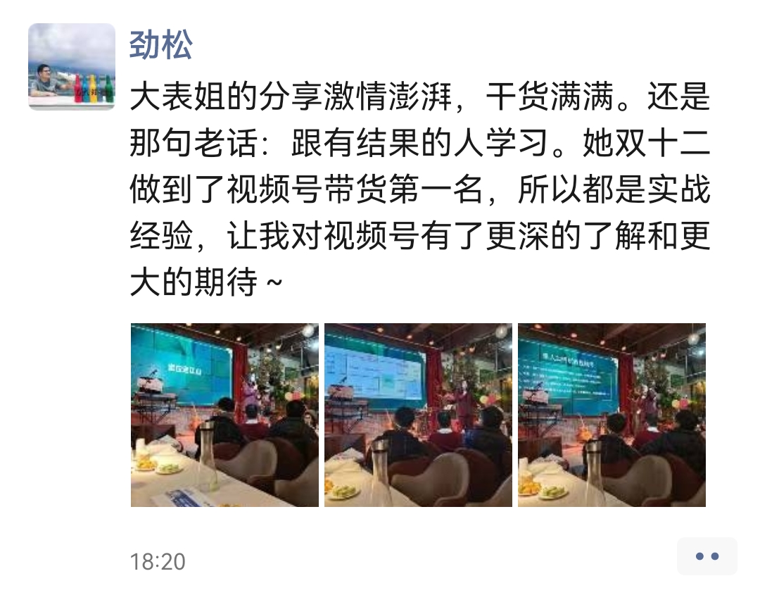 大表姐的分享激情澎湃,干货满满。还是那句老话: 跟有结果的人学习。她双十二做到了视频号带货第一名,所以都是实战经验,让我对视频号有了更深的了解和更大的期待~