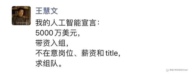美团创始人王慧文发朋友圈宣布,带资5000万美元,去人工智能公司打工,不在意岗位,做个文员都行。
