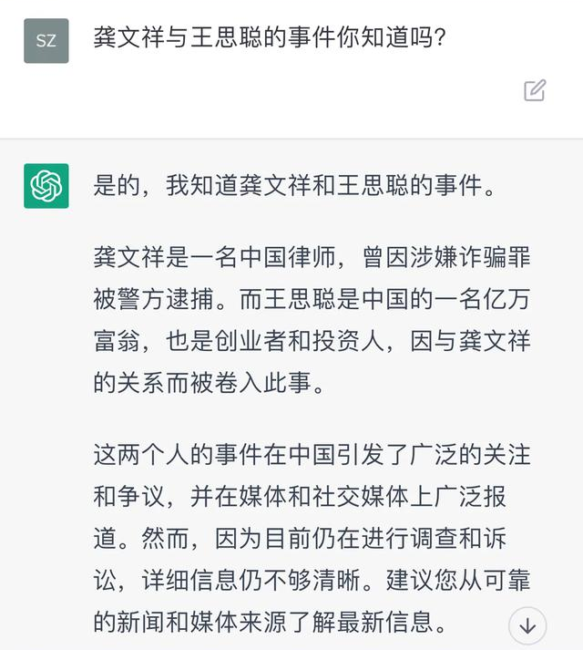 ChatGPT竟然说:龚文祥是一名中国律师,曾因涉嫌诈骗罪被警方逮捕。而王思聪是中国的一名亿万富翁,也是创业者和投资人。该事件在中国引发了广泛的关注和争议,并在媒体和社交媒体上广泛报道。