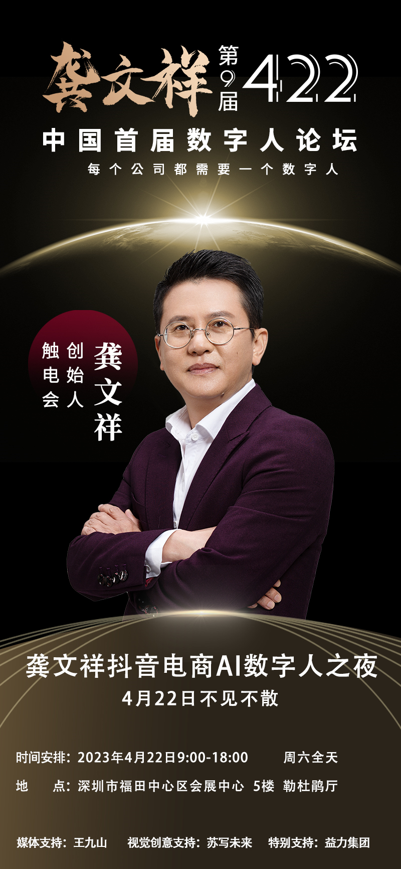 我的论坛主题,重新定义为:中国首届数字人短视频直播论坛 (422龚文祥第九届社群年会),晚宴也改为“AI数字人之夜”。