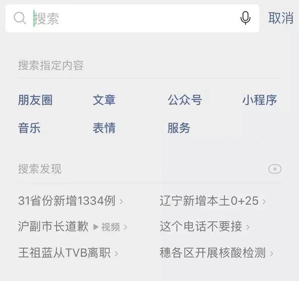 微信推出了一个“搜索发现”功能,点击主页面上方搜索栏即可看到。系统会在搜索框底部,罗列出最近的搜索热点词和热搜事件,有助于用户更好的了解时事。如果你不想看到,也可以点击 × 来关闭。