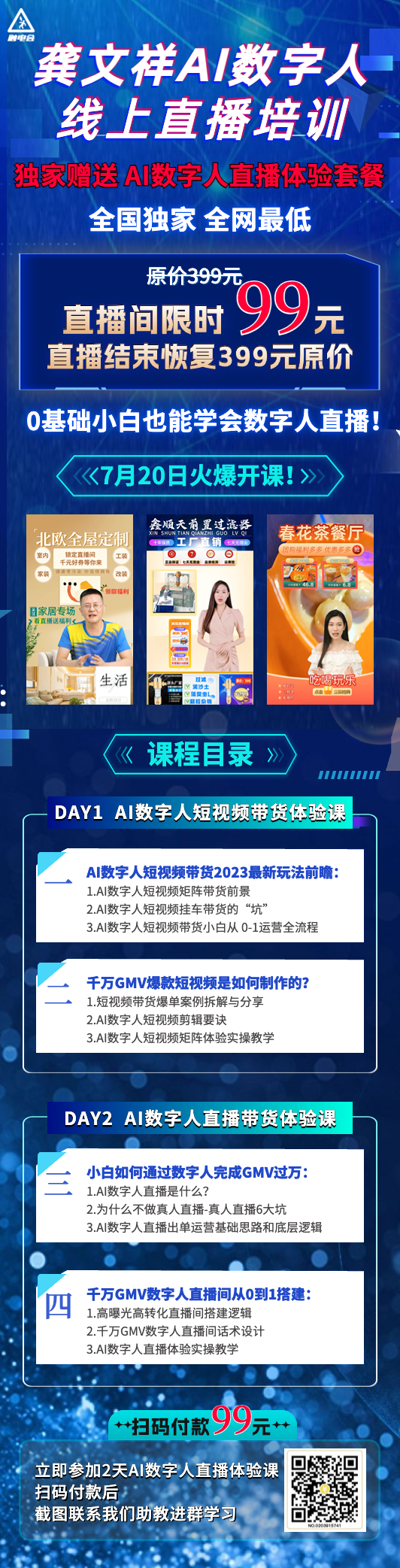 我全网独家推出:99元AI数字人短视频+直播体验课,0基础小白也能上手数字人,2天就能从小白到精通。