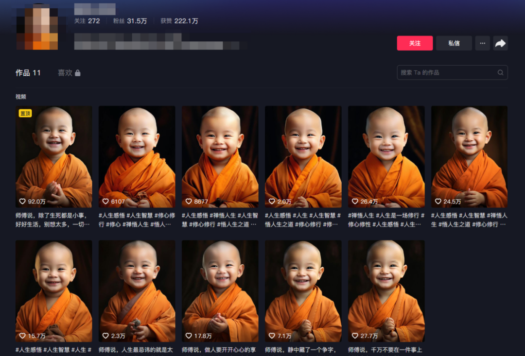 用数字人做AI小和尚,一张照片生成的数字人,搭配禅语语录,单个账号一周涨粉31.5W。