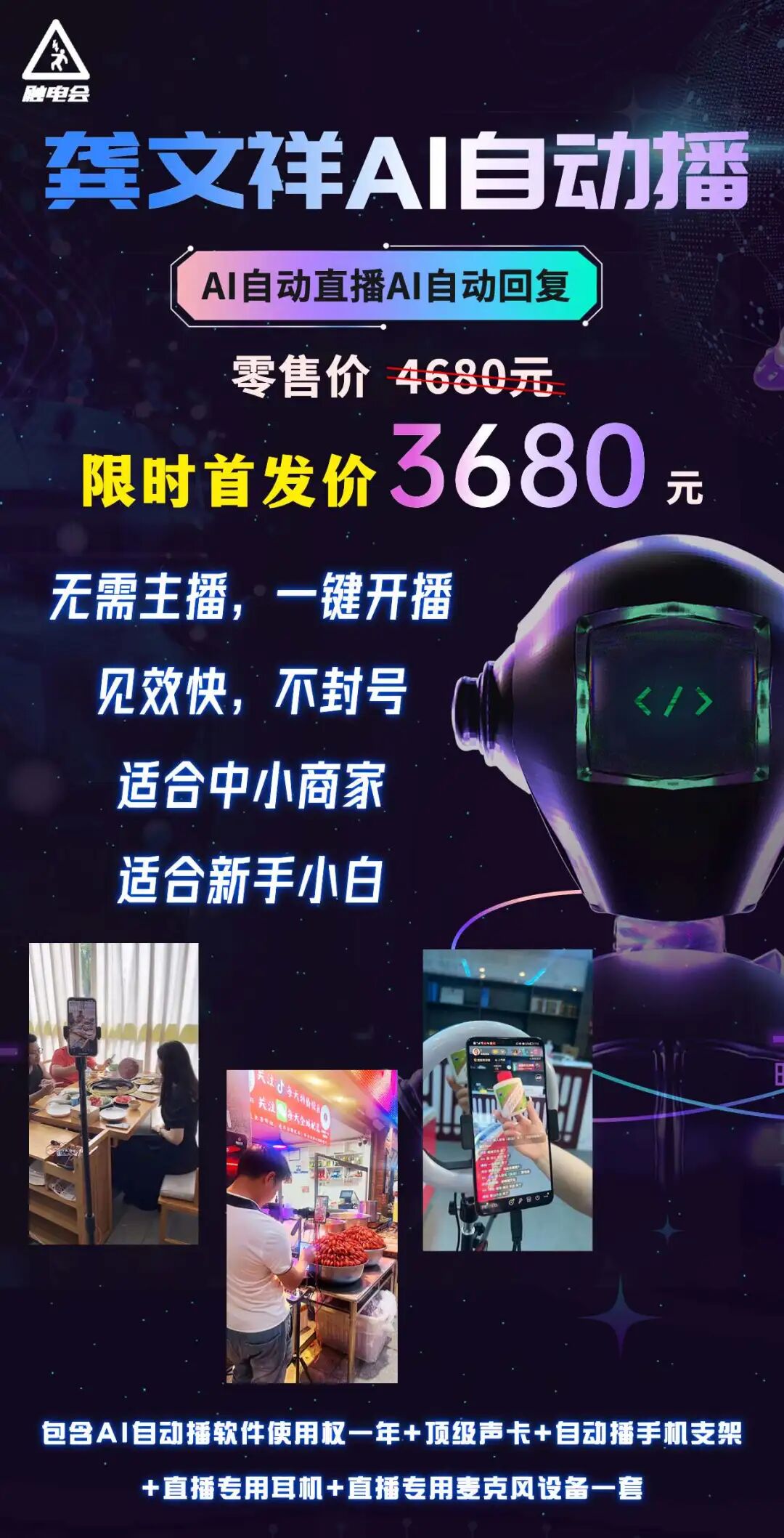 新品首发福利价,限时直降1000元,现在只需要3680元,就可以拥有一套我们的AI自动播系统