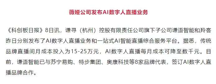 目前,薇娅公司已与苏宁易购、特步集团、奥康科技等8家品牌代表,签订AI数字人直播品牌合作。