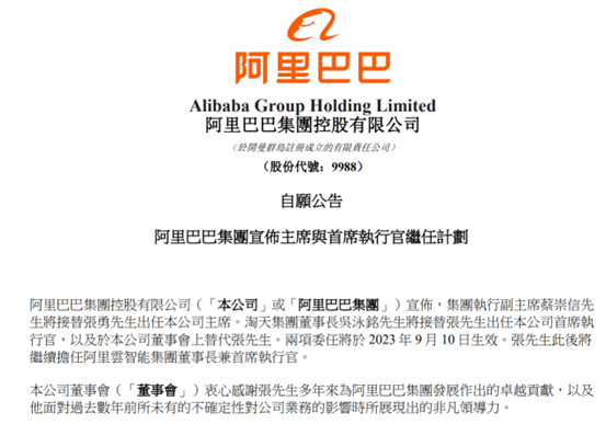 蔡崇信接替张勇成董事会主席,吴泳铭出任CEO。