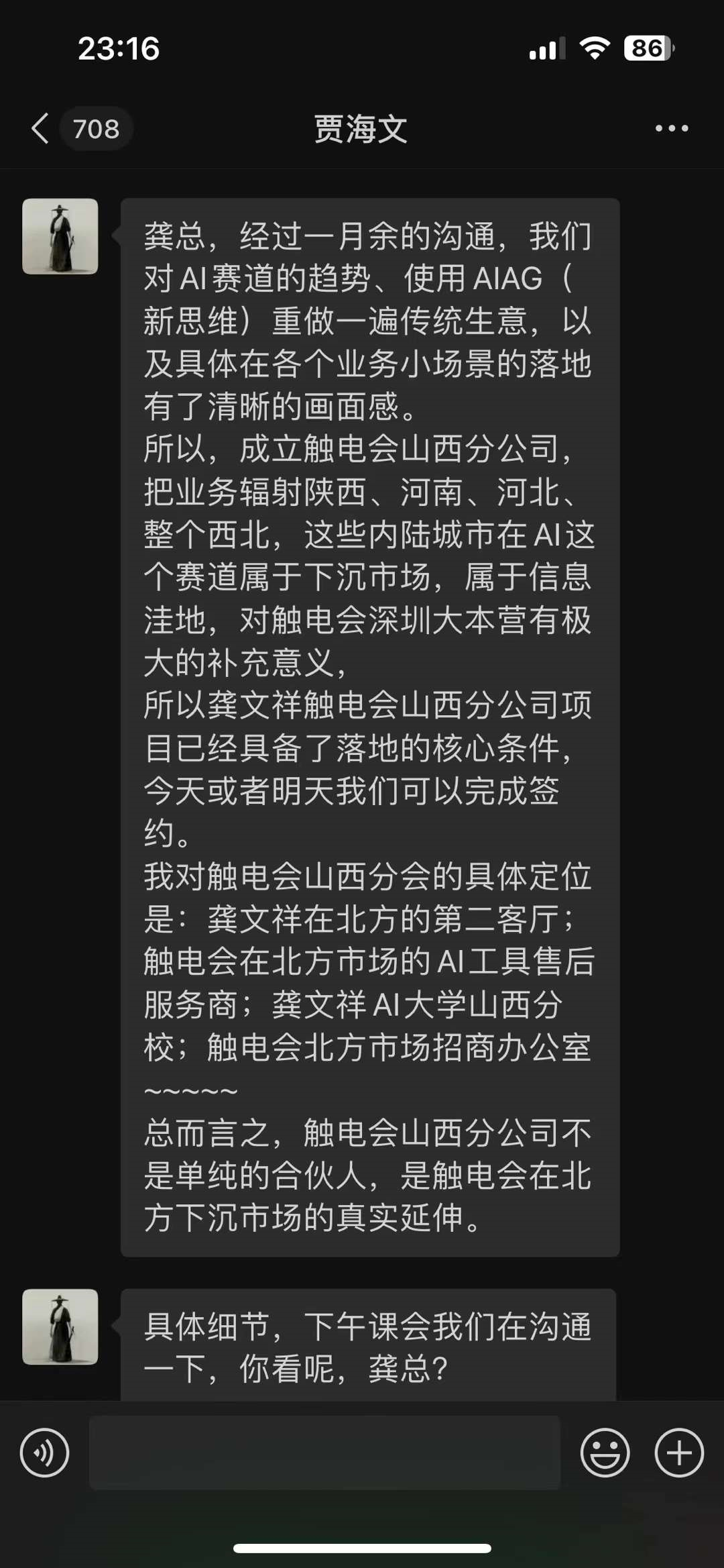 大家看看,AI贾总加盟触电分公司的诚意和具体规划: