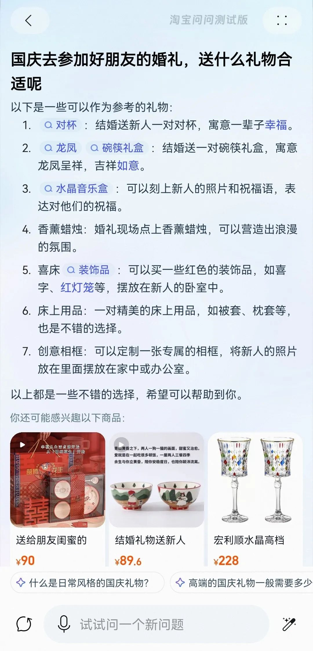 实现了AI+电商场景:淘宝以电商交易为导向,因此淘宝问问是针对电商导购场景的体验升级,AI给出的回答,能关联目标商品,满足不同的购物需求,缩短路径:内容种草到电商拔草。