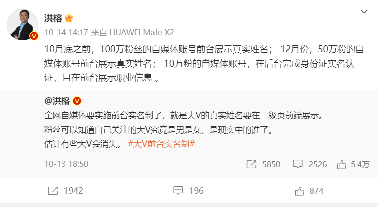 多位自媒体大V发文透露,全网自媒体即将实施前台实名制,即大V的真实姓名,要在一级页面前端展示。