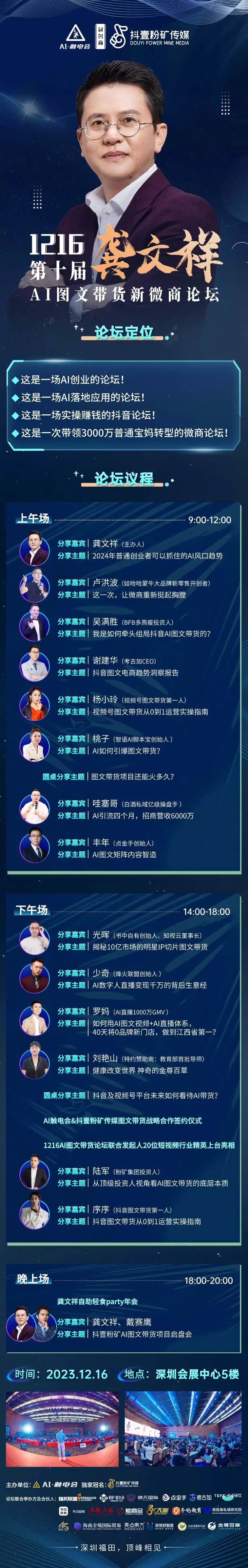 我将1216论坛定位为:10年来第一次,以公益论坛的形式,普及抖音AI变现的创富机会,号召大家都多多走出来,多看看。