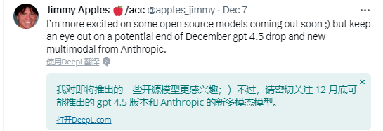 据X用户@apples_jimmy爆料:“OpenAI或将在12月月底前发布GPT-4.5。”