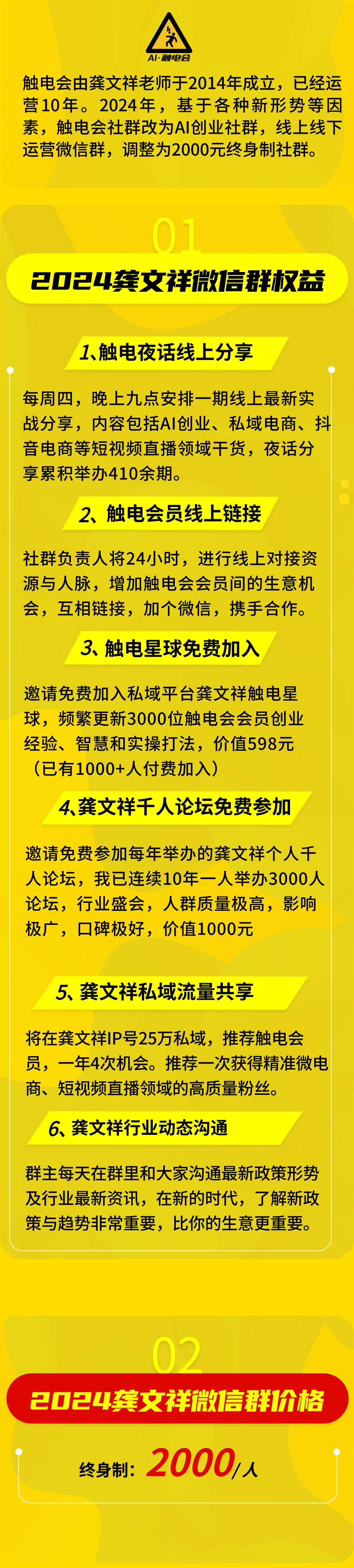 2024年,基于各种新形势等因素,我将触电会社群,改为AI创业社群,线上线下运营微信群,调整为2000元终身制社群。