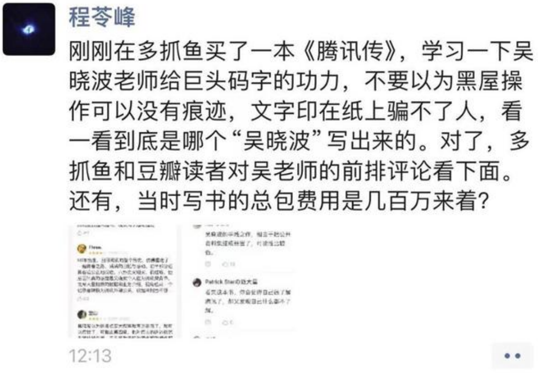 这个月初,程苓峰在他的公众号卢泓言上,他就爆料说:吴晓波老师写的《腾讯传》这一本书,是三个年轻的记者写的,吴晓波老师只是带着采访了一下,然后润笔了一下。