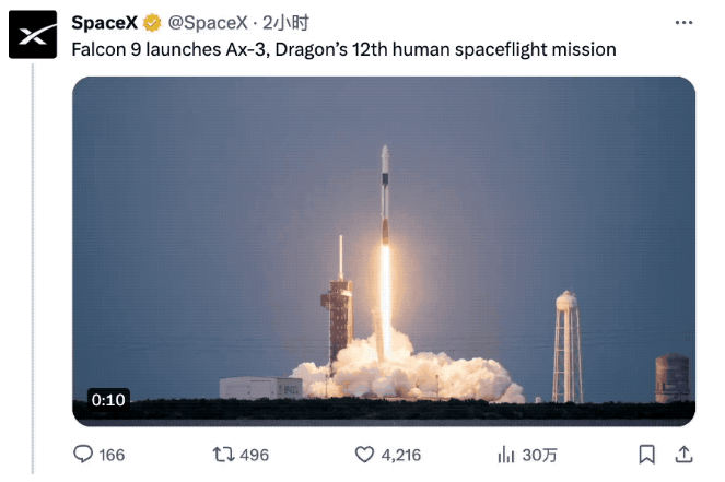 2024年1月19日,SpaceX执行了第301次发射任务,第12次载人飞行,这次送4名“私人”宇航员上太空。