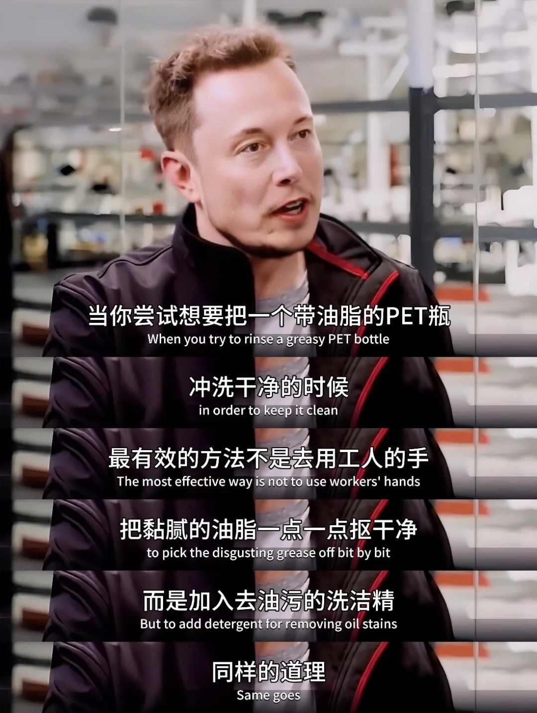 马斯克说,当你尝试要把一个带油脂的瓶子,把它冲洗干净的时候。