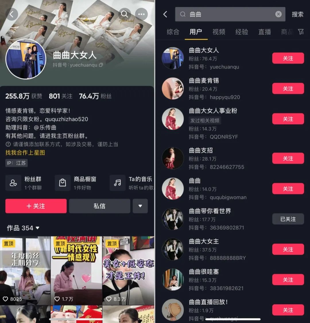 我查了一下,这个曲曲大女人,封杀前,应该是中国第一情感主播,我也在抖音,刷到过几次她的直播间。