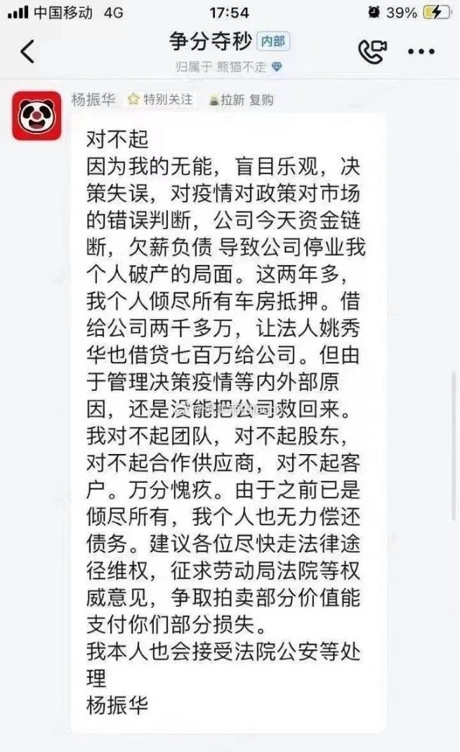 最近,熊猫不走创始人杨振华发文称,因为自己决策失误,导致公司资金链断裂,公司停业以及个人破产。