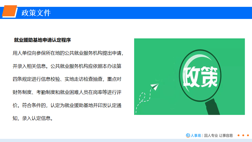 即:依法与职工签订劳动合同,为职工缴纳社会保险费,其招用就业困难人员(含招用享受政策期满的就业困难人员)数量或比例,符合以下条件之一的用人单位,可向其参保所在地的公共就业服务机构,提出就业援助基地认定申请。