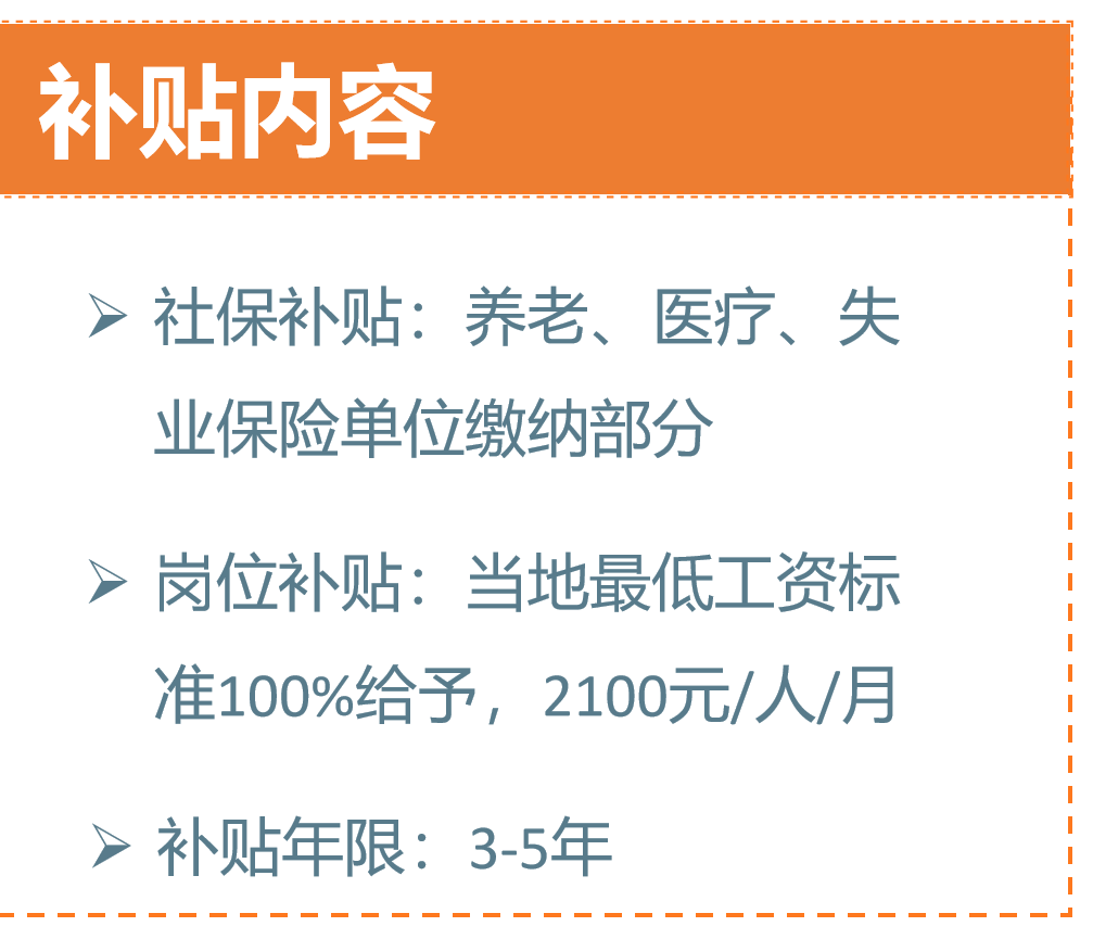 1.社保补贴:实行“先缴后补”的办法,其标准是:按企业为其实际缴纳单位部分的城镇职工基本养老保险费、基本医疗保险费(含大病)和失业保险保险费给予全额补贴,不含个人部分。