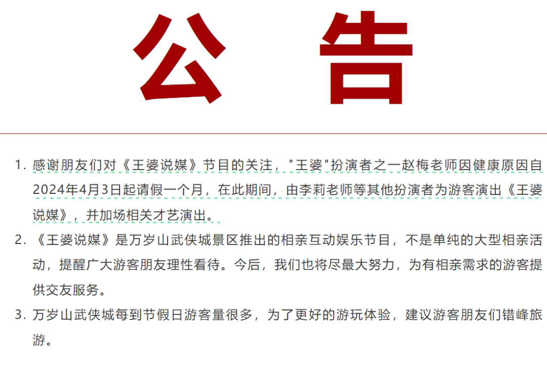 所以,开封就发布官方公告,称王婆因健康原因告假一个月。