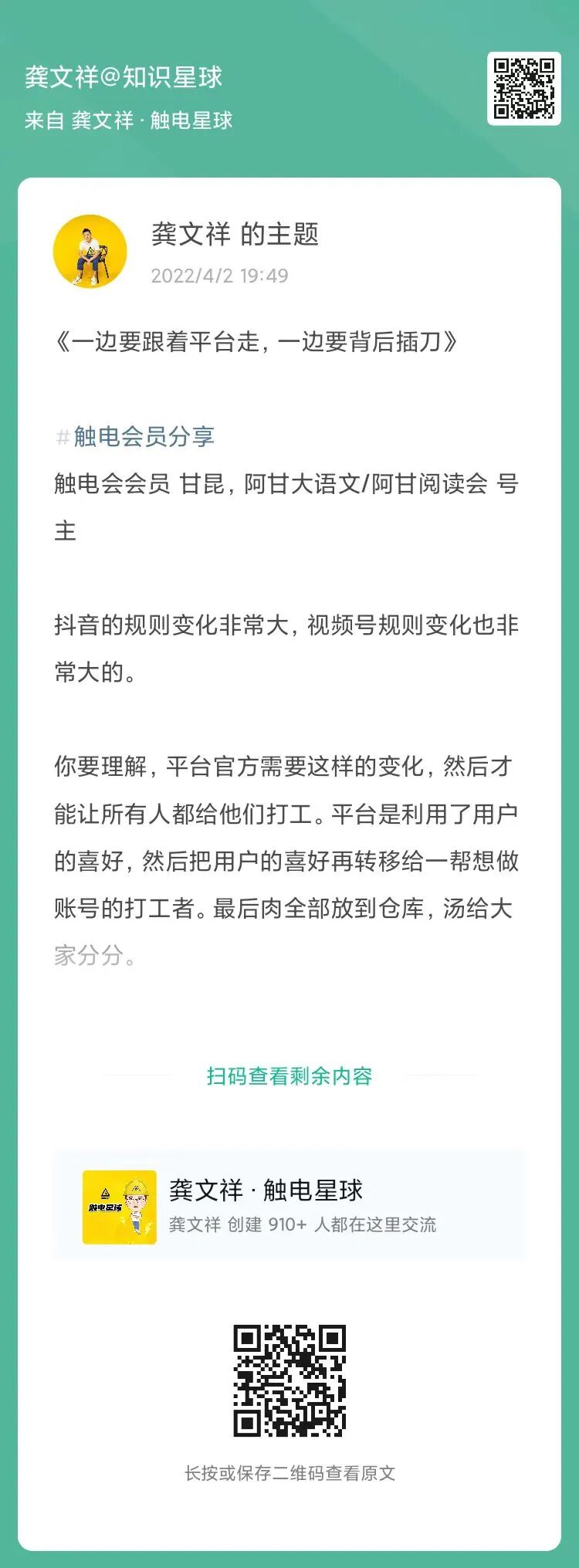 02、事实上是,你不知道哪个时候连这碗汤也会被收走。如果看你不顺眼的话,汤也不给你喝。你得了解官方的逻辑,抖音的逻辑和视频号逻辑,你不当舔狗连汤都没得喝。即使你要跟着官方,但是背后也要插刀,这个事才玩得了。