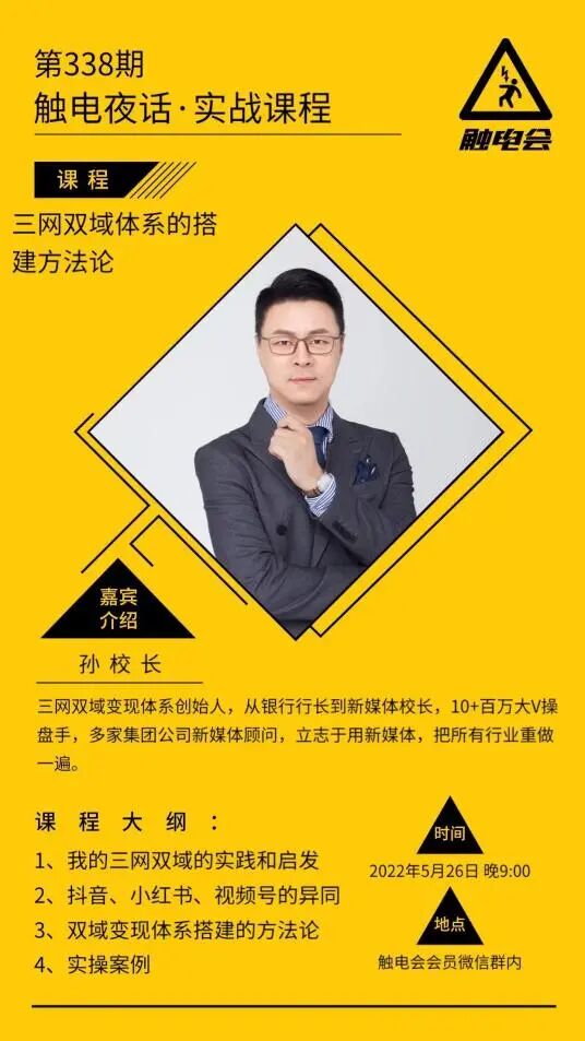 Hello,大家好,我是孙校长,非常感谢龚老师,给了这个机会来跟大家交流啊,也非常开心,能够跟我们触电会的会员们,做一个沟通。