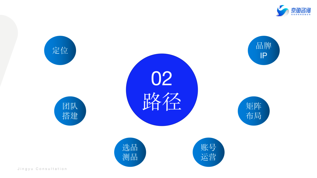 第二个部分是团队的搭建,第三个,我们要选到我们合适的产品,第四部分才是我们的账号运营。第五部分,当我们的第一个账号做好了以后,我们开始我们的矩阵化的布局。