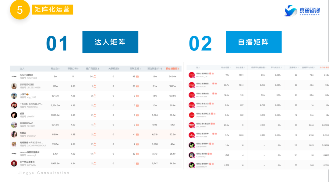 第五个步骤的话,当我们把自己的直播间做好了以后,我的建议就是大家可以去矩阵化运营了。矩阵化运营分两个,第一个叫达人矩阵,第二个叫自播矩阵。