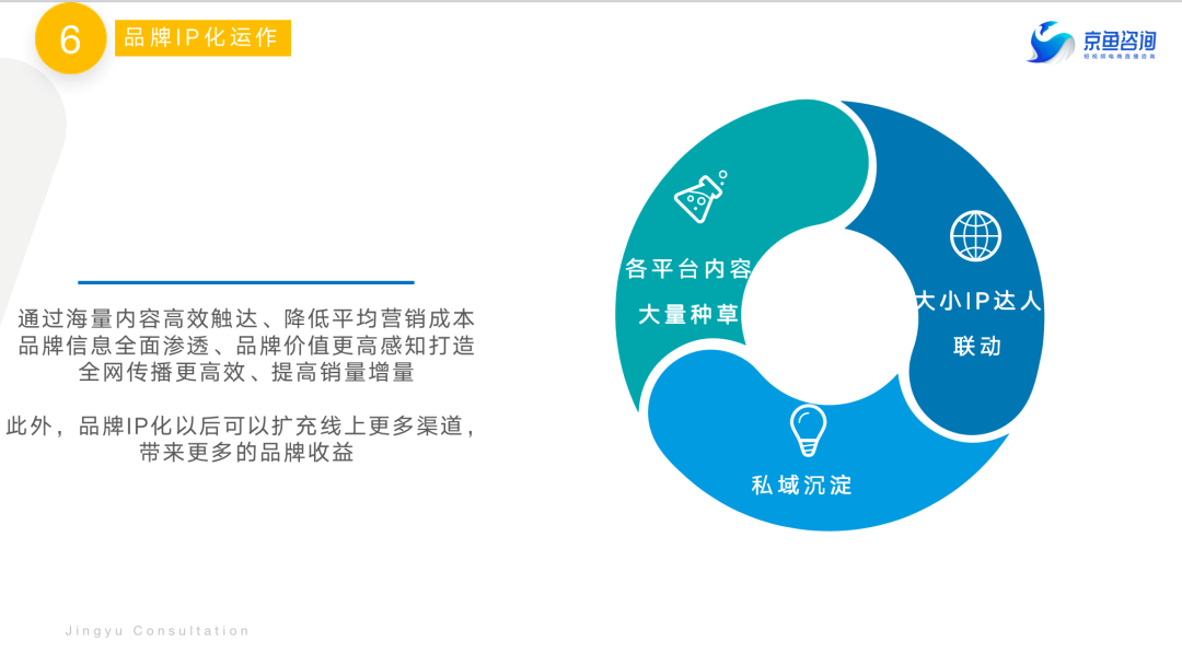 第六个部分就是我们的产品,最后会走的一条路,要么我们就做品牌的IP,要么我们就退居二线,成为我们的渠道啊,成为我们的上游。