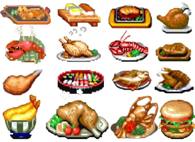 街机游戏中的食物一般都分为三六九等,最大的食物往往都是大型的肉类、乳猪、鸡肉、牛排、寿司或者龙虾,有营养又好吃。补血量稍微少一点的食物则以蔬菜水果为主,而最小的补血道具往往都是饮料类的。