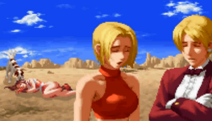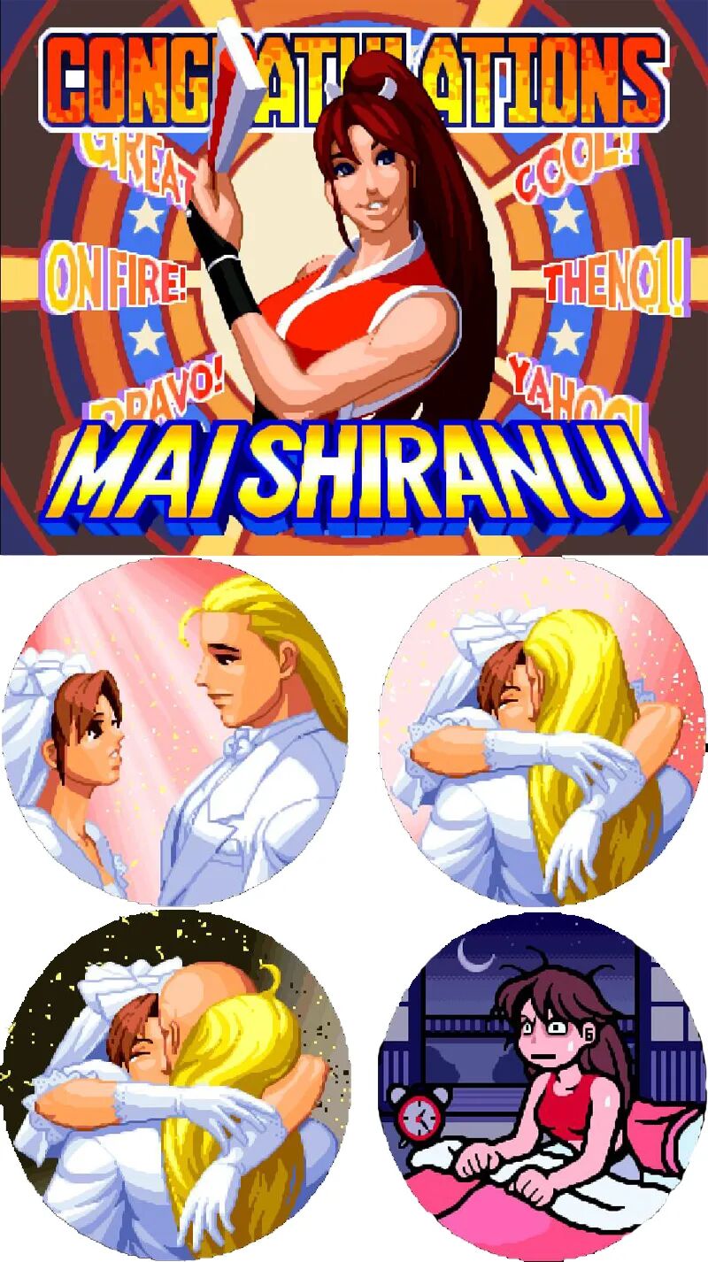 不知火舞通关后终于和安迪结婚了,喜极而泣的她,热情拥吻着安迪,但是没想到安迪头发一碰就掉,吓得不知火舞一个机灵,原来是虚惊一场啊!