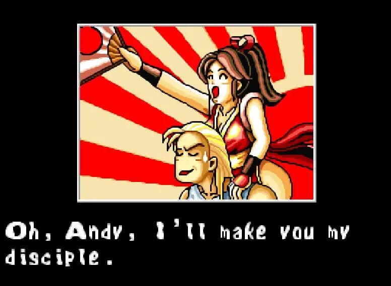 不知火舞打通关之后,她趴在安迪的背上大声叫到:Oh,Andy,I'll make you my disciple